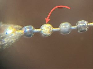 顕微鏡をのぞき込みながら球体の中へ芯棒を入れ込み☟