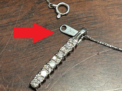 引っ掛けて切れてしまったプラチナ製ダイヤモンドバーペンダント。チェーンを直すだけでなく、バチカン部分を加工してネックレスの付け替えができるよう改良。大切なジュエリーを、もっと安心して・もっと自由に使えるようにした修理事例です。