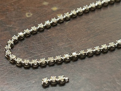 「プラチナのダイヤブレスレットが少し大きく、引っ掛けて切ってしまいそう…」そんなお悩みを解決!約1cm(3コマ分)を外し、顕微鏡を使った精密なロウ付けでジャストサイズにお直しする安心の修理工程を大公開します。