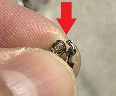 修理修正、まずはルーペで覗き現状を確認。パーツについてあるマルカンが折れている感じっ。