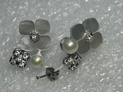 修理完成後の花モチーフ・パール・ダイヤモンドピアス2個を正面から撮影、新しいキャッチ付きで左右対称に並んでいる